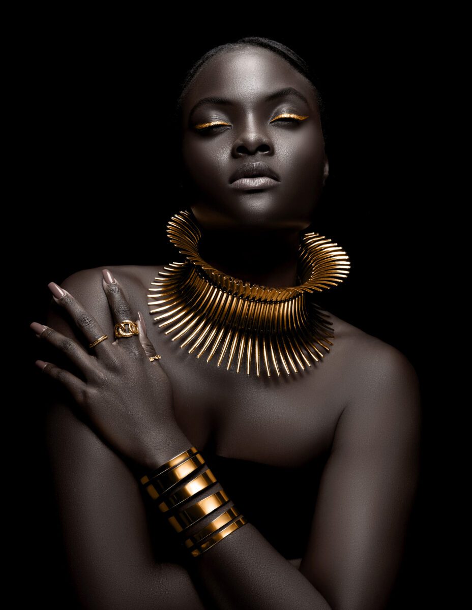 Frank Zhang uses photography to celebrate the worldwide influences that have shaped fashion. Aesthetics from Africa centres Ghanaian model Sonia Barbie Tucker, as Zhang explains: “For a long time, the fashion industry’s perception of beauty was seen through a Eurocentric lens.” In the series, Tucker is adorned in structural, gold jewellery, everything about her suggesting power and confidence.