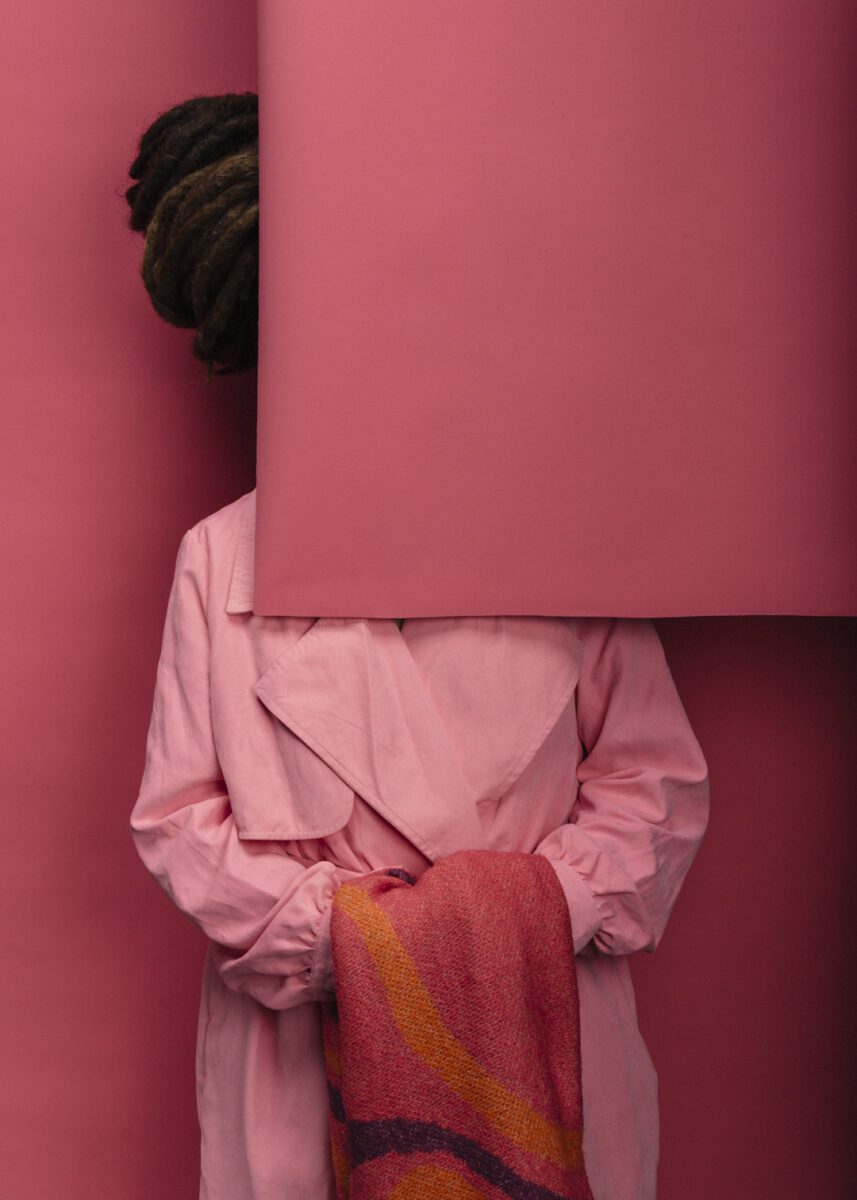 Polish photographer Paweł Piaskiewicz tests the boundaries of anonymity. The series ANO/MONO (2023)questions how far a person can be stripped of their defining traits whilst still maintaining their individuality. The images show figures hidden behind colourful paper shapes. In one, only a glimpse of hair is visible from the side of a pink square, a coat and blanket obscuring their body. Elsewhere, a woman emerges from behind a navy backdrop, as white netting hides her face. Monochromatic colour palettes and simple compositions minimise distractions, allowing small details to stand out. The emergence of a hand, the flow of long hair or the arch of a back all become central to the shot. Viewers are left asking: if this was a person I knew, would I still be able to recognise them? The artist leaves the audience with questions, rather than providing answers.