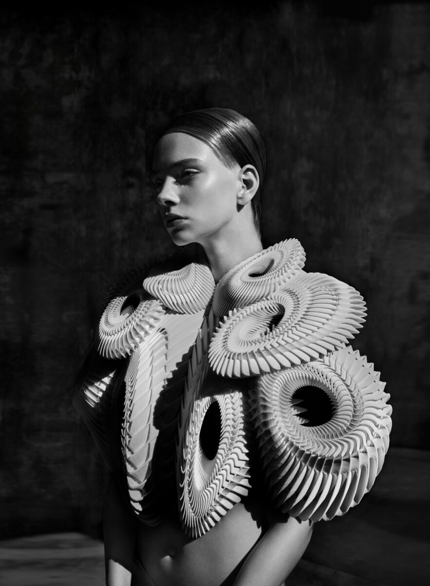 6.Iris van Herpen. ‘Crystallization’ top, Crystallization collection, Haute Couture, 2010. Utilising selective laser-sintering 3D printing technologies, made from polyamide Photo by Sølve Sundsbø Model: Kyona van Santen.
