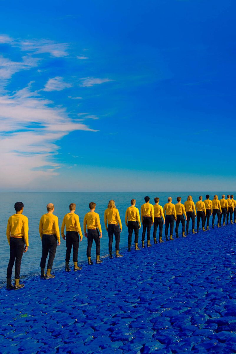 The use of colour is striking. It is the result of a layered process that provides a distinct and heightened sense of myth. Each mundane landscape is transformed with intensive post- production techniques. “These are just as important as the photograph itself,” Marušić points out. “The photograph is just a starting point, a sketch.” This initial stage is carefully composed and pre-planned, in which scene compositions are mapped out in advance, alongside props and costumes. The editing process involves stripping back large amounts of detail to pare back extraneous details and reveal the stark essence of the photo. There is an “abstraction and emptiness” to an image in its barest form, which is then manipulated with colour – adding rich depth and impact to the resulting piece.
