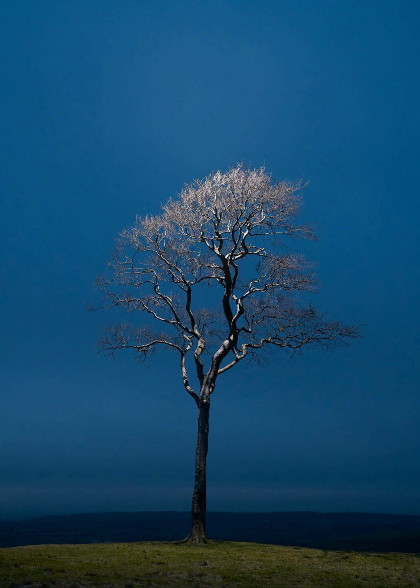 One of the oldest-known living trees – a Great Basin bristlecone pine that is around 5,000 years old – can be found in the White Mountains of California. Its specific location is kept a secret by wardens, to prevent harm. There is an inherent sense of mystery about forests and woodlands. What’s perhaps the most astonishing is their ability to communicate, sharing information via electrical impulses, smell and taste. This idea of the “wood wide web” was out- lined in The Hidden Life of Trees (2015), as a network of soil fungi that allows vegetation to interact. Gareth Iwan Jones (b. 1981) is fascinated by these ecosystems. The Tree series is inspired by Wiltshire, where the distinctive landscape features knolls with lone or small groves of trees raised above the horizon. Here, they are pictured at dawn or dusk – lit with the assistance of drones. “I felt humbled to spend time with these elder beings and wonder what adventures they have witnessed during their lives.”