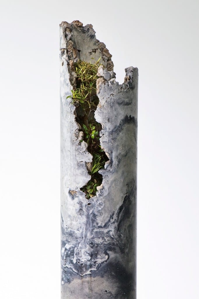 The plants positioned within the man-made pylons comfortably complement one another. The process which the concrete undergoes lends it an almost organic and aestheticised appearance, making it a suitable-looking object to support the growth of organic life. There is a feel of rejuvenation expressed in the installation as the plants spread life, suggestive of the progression of time. A new stem begins to materialise and take control, defining its valuable and necessary purpose as it seeks room to expand.
