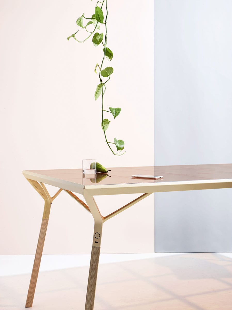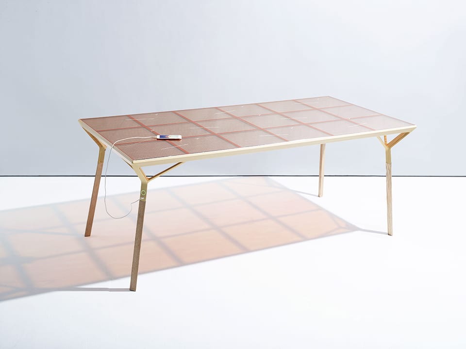 Aubel’s other projects include the Current Table, which has an in-built solar panel surface. Made of dye-sensitised solar cells, it generates electricity to recharge numerous devices through integrated USB ports located on the side of the table. As in photosynthesis in plants, the technique makes use of the properties of colour to create energy. Last but not least, like all Aubel’s other projects, this ingenious technical solution is not stripped of its elegant appeal. The solar panel sits on a wooden base with sophisticated triangular legs.