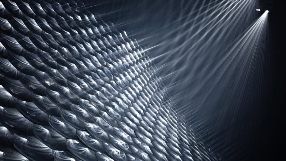 Seoul-based art and technology duo Kimchi and Chips’ dynamic installation is on view at QUAD, Derby. The work comprises a complex web of threads that forms three-dimensional images when illuminated. Examining notions of immateriality and the digital age, the work crosses multiple conceptual boundaries.
