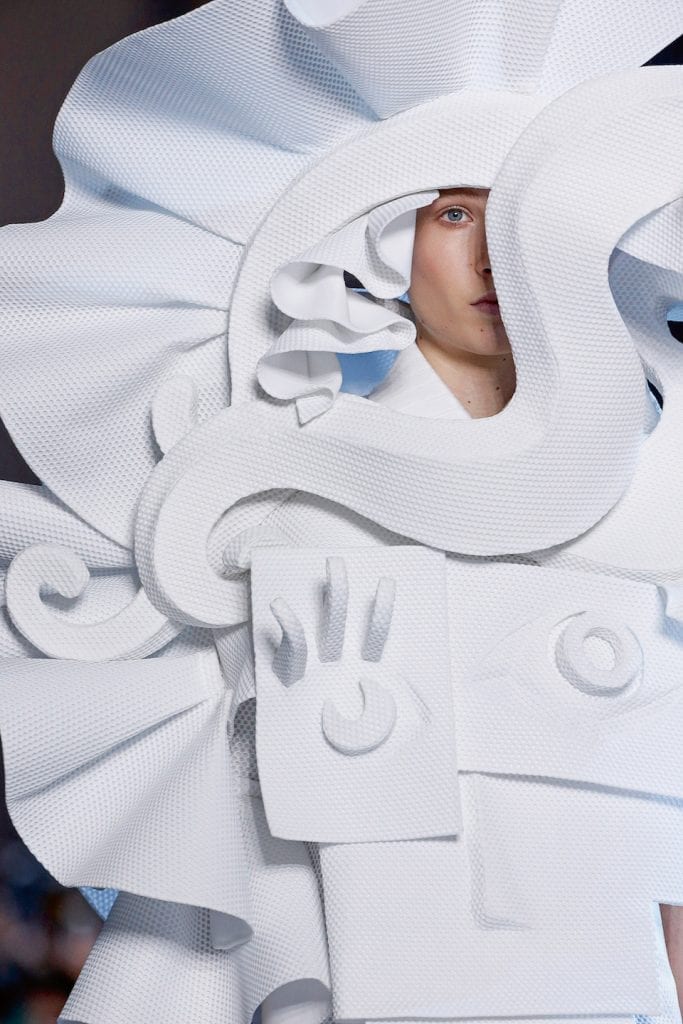 Performance of Sculptures (Spring / Summer 2016) comprised works in which the boundaries between wearer and clothing all but dissolved: the models were frequently hidden underneath the monumental, oversized pieces, and the overall impression left was one of both a “sculpture that had been humanised and a model that had been sculpted.” The dynamism of art, be it visual or constructive, is tapped into for each creation: the voluminous gowns and extravagant accessories presented here all display exactly the kind of inviting, tactile three-dimensionality that one usually expects to encounter in an art gallery.