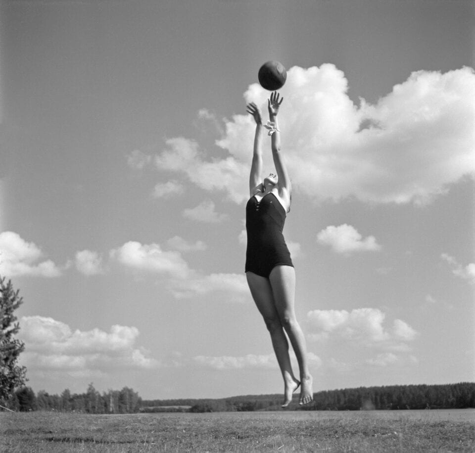 Featured above is Kazys Daugėla’s Gymnast, which captures a figure in mid-air, arms outstretched. A ball hovers just out of reach, heading upwards towards a cloud-dappled sky. It is an image that evokes the warmth of summer days, whilst experimenting with movement on film. It was taken in the late 1930s, but remains strikingly contemporary. The photographer is best known for his poignant work during the war, recording the experiences of Lithuanian deportees at the Kempten camp in Bavaria.