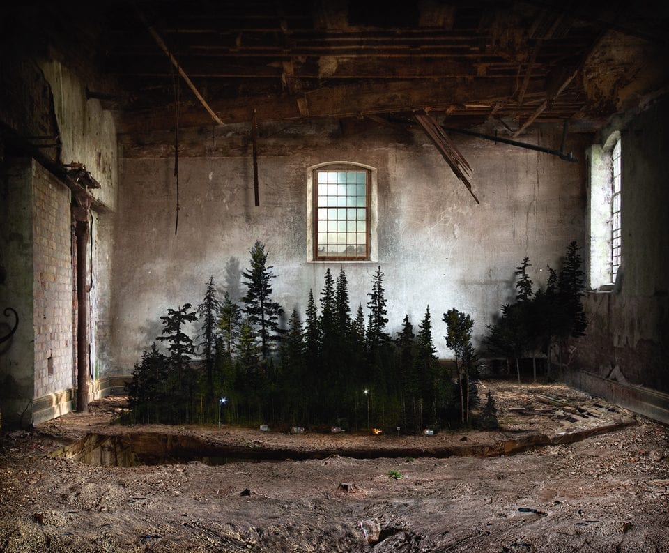 Moxhay was included in the 2015 Aesthetica Art Prize Longlist for Copse (2014), a work that brings forth questions of barriers, spaces and archival material. She notes: The imagined space of Copse is developed by combining fragments of collected imagery, ranging from photographs and prints in old magazines to painted elements. The “place” is not quite as believable as being real, having instead the quality of an empty film set. In the latest work, I have concentrated on interiors – spaces that in some way break down to reveal the outside.These arenas do not quite fit – it is sometimes unclear where the light is coming from, the angles of the rooms are awkward and shadows fall in the wrong places – these are clues to the construction of the image but also lend them a peculiar quality, familiar but also unsettling or uncanny. The resulting images invite the viewer to speculate on possible narratives within these alternative and captivating interiors, often suggesting an event that has just taken place or is about to happen.”