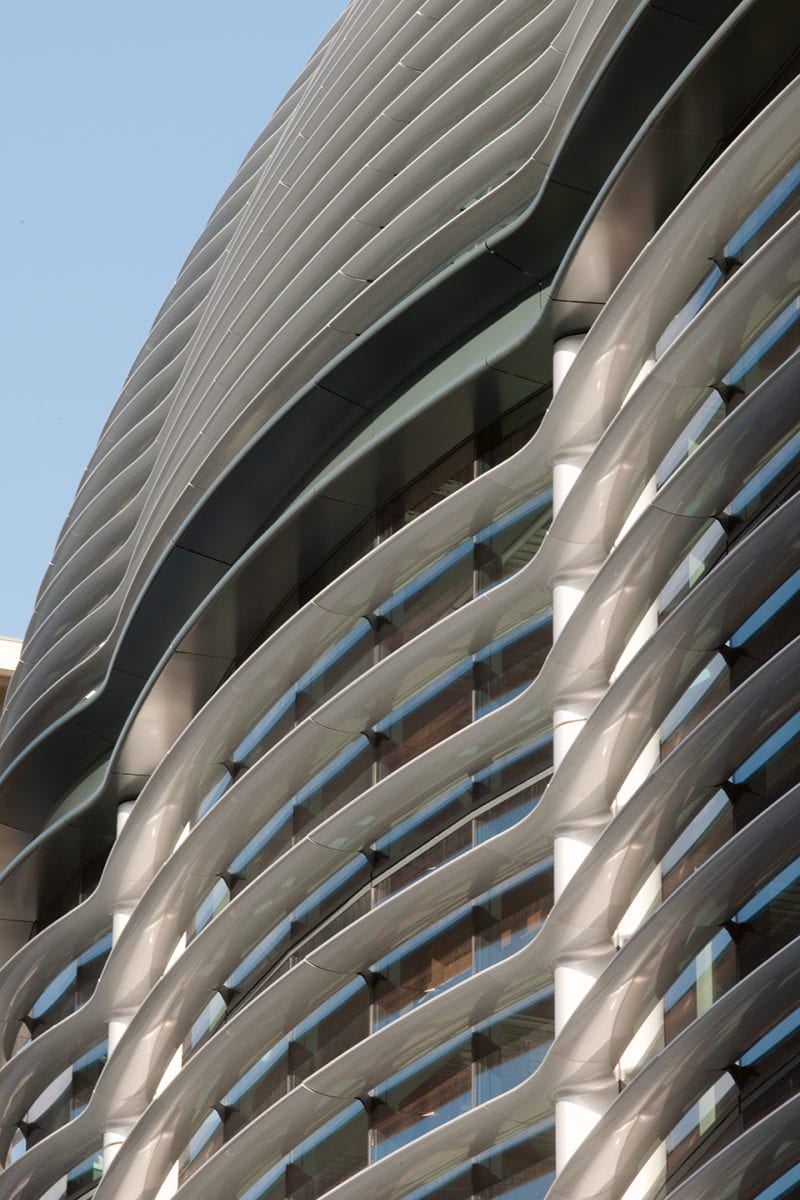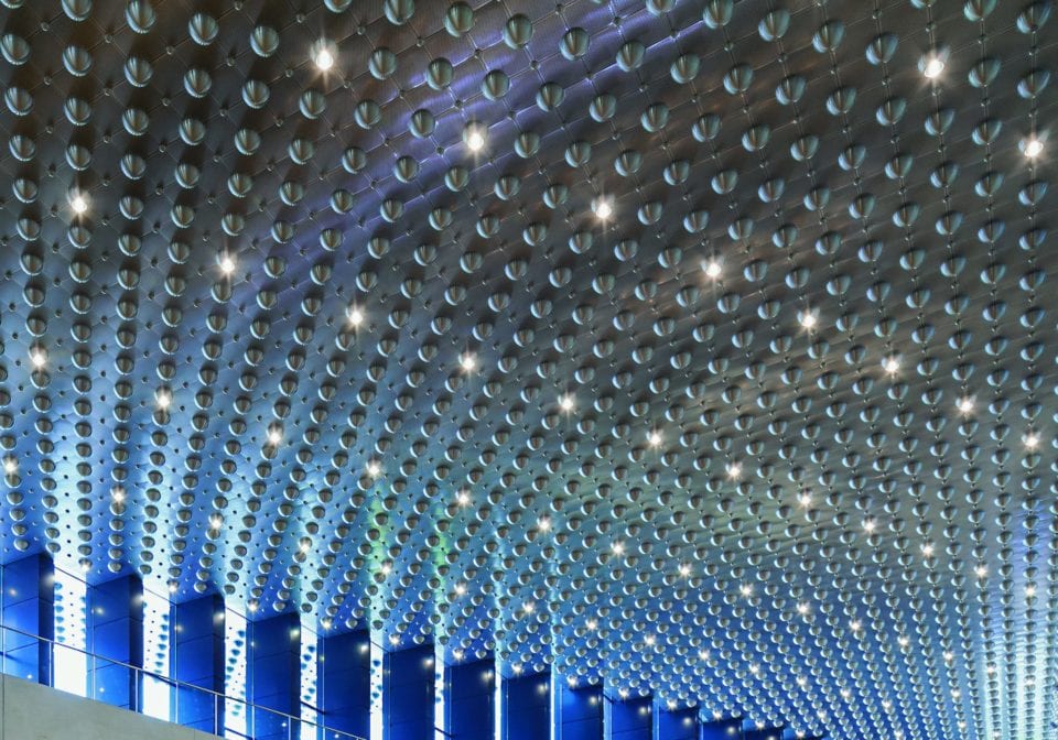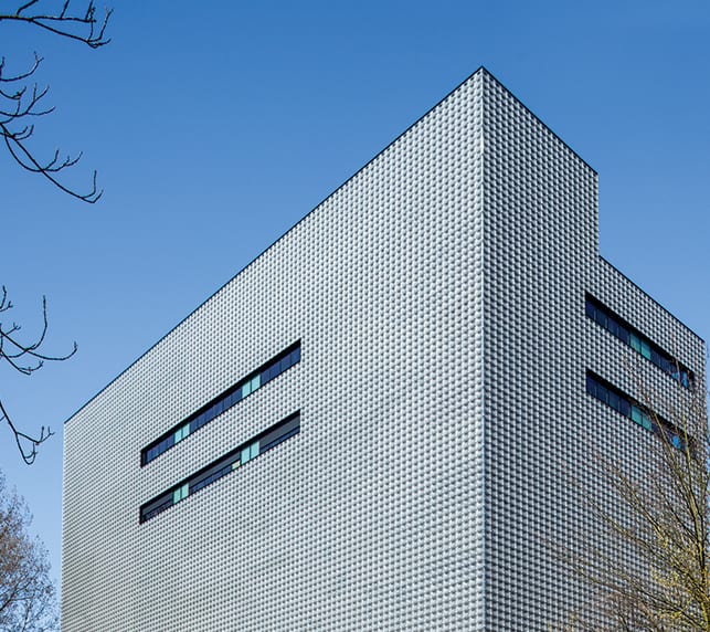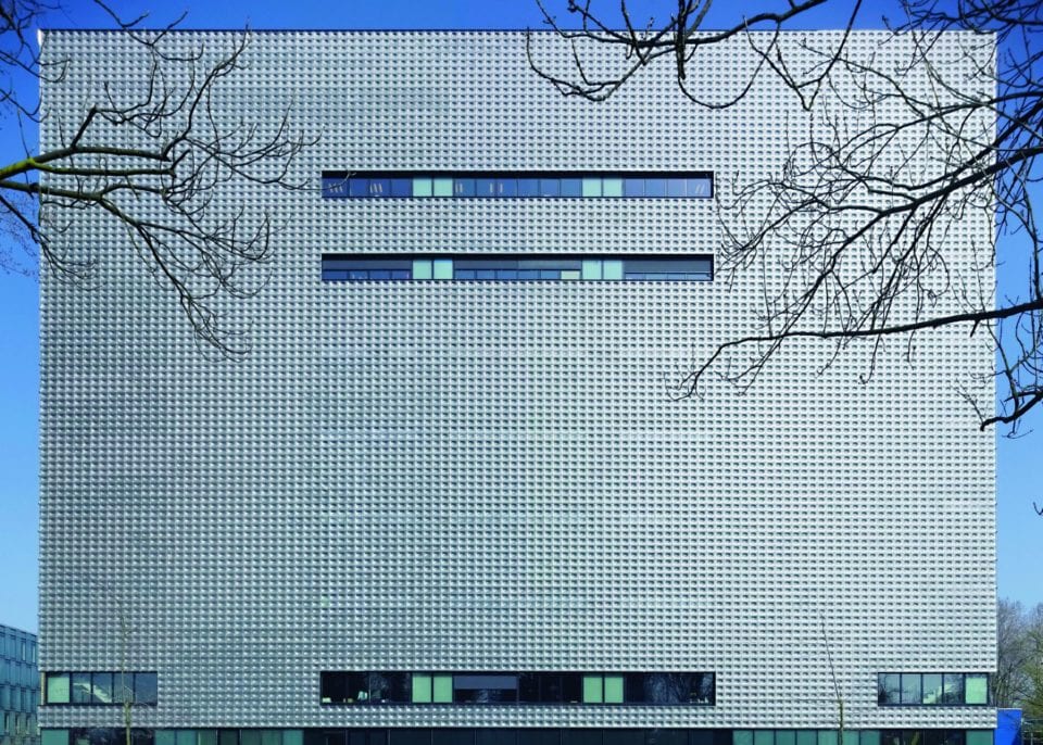 Ecker’s airy concrete-and-glass creation is a contemporary response to the surrounding mid-century modern campus constructions, many of which date back to the 1960s. The latter technique, spinning (also known as tuning or spin forming), is a mode adopted by Neutelings Riedijk Architects for the Culture House Eemhuis in Amersfoort, The Netherlands. To execute the radiant exterior of this sprawling cultural complex – one part of Bolles + Wilson’s massive overhaul of the Amersfoort city centre – the Dutch firm produced 24,000 spun aluminium components that add a luminous sheen to the surface of the structure, whilst also concealing and protecting certain utilities and mechanical apparatuses.