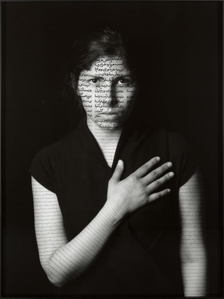 In a similar analysis of women’s agency in the Arab world, Shirin Neshat’s Women of Allah (1993-1997) grew out of a visit to her native Iran 15 years after the Iranian Revolution of 1979. These portraits, overlaid with Persian script (the words of contemporary Iranian women writers), highlight the crucial role that women played in the uprising. To Neshat, “Iranian women are quite powerful, unlike their clichéd image.” Incorporating elements of the veil, guns, text, and the gaze, these empowering compositions break down Orientalist tropes of female submission: one woman’s text-covered hand, when raised to her closed mouth, gives her a voice.