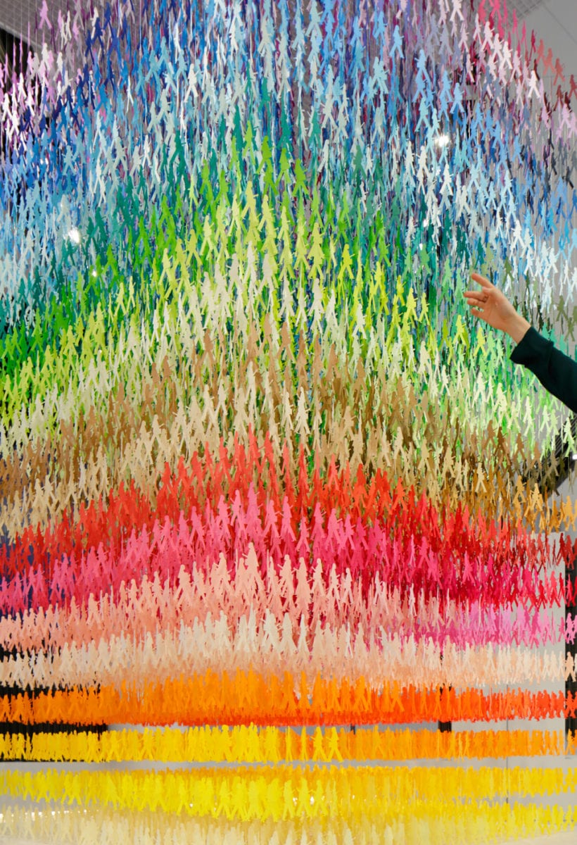 Emmanuelle Moureaux’s exploration with colour began in 1995 – during my first visit to Tokyo. She was deeply intrigued by the city; it was formed by infinite layers and living colours. In response to the experience, she came up with a design concept, “shikiri”, which means “to divide space using colours.” Using them as three-dimensional elements, like layers, in order to create spaces – Moureaux applies them not as a finishing touch, but part of the surfaces. To express the essence of “shikiri”, I began the 100 colors installation series in 2013, using 100 shades of colours each time. Using 18,000 cut-outs of repeated figures, she gives a sense of anonymity. The overflowing effects of I am here offer up not just a bright installation but also one stratified by the different feelings evoked by association.