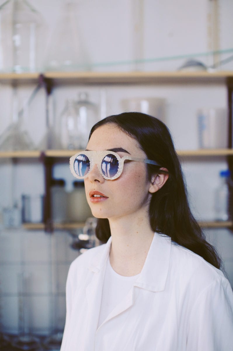 This open-ended energy is channelled succinctly into the production of beautiful and sculptural pieces. The work has evolved since the team’s first collection, which was hand-crafted, and has now moved towards the use of technology and filament 3D printing. As such, the delicate frames fulfil their potential as scientific experiments, whilst responding to contemporary fashion trends. The team has also begun to play around with colours: “For our second collection, the products are available in Orange Seaweed, Bohemian Green, Mysterious Blue.” There is a fourth option: Nude. In the process of creating the new line, the colour of the material evolved into an ivory shade that resembled a pale skin tone. Whilst the frames are biodegradable, lenses are made from mineral glass: there is currently no “bio-based” alternative on the market, but this is at least recyclable.